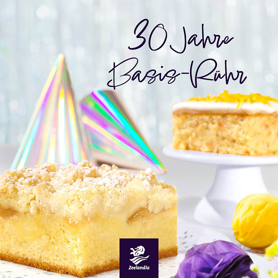Kaum zu glauben, wie schnell die Zeit vergeht. Unser vielseitiges Top-Produkt Basis-Rühr feiert 2026 Geburtstag. 30 Jahre voller Geschmack, Erfahrung und Individualität und kein „Stück“ älter. Unser Allrounder Basis-Rühr gönnt sich keine Pause und feiert mit neuen Birthday Cake Kreationen sein Jubiläum. Feiern auch Sie mit und probieren Sie unsere 10 Jubiläumsrezepte aus: ob fruchtig im Familienkreis, nussig mit Freunden oder schokoladig am Abend. Für jeden Party-Typ ist der richtige Birthday Cake dabei! Holen Sie sich unseren Bestseller für individuelle, vielseitige Rührkuchen mit einzigartigem Geschmack und ausgezeichneter Frischhaltung in Ihre Backstube. Sorgen Sie z. B. mit dem Birthday Cake Zwetschge-Creme oder mit dem Birthday Cake Rübli-Marzipan für echte Party-Stimmung in Ihrer Gebäcktheke.