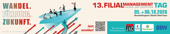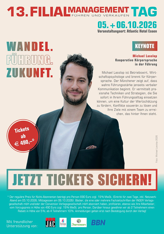 | | WANDEL. FÜHRUNG. ZUKUNFT. Der Filialmanagementtag geht in die 13. Runde. Am 5. und 6. Oktober 2026 trifft sich die Branche im Atlantic Congress Hotel Essen. Zwei Tage stehen im Zeichen von Führung, Verkauf und Zukunft im filialisierten Bäckerhandwerk. Praxisnahe Impulse, konkrete Erfahrungen aus Betrieben und ein Netzwerk-Abend mit Dinner in Buffetform machen die Veranstaltung zu einem Treffpunkt für alle, die Verkauf und Führung im Bäckerhandwerk aktiv gestalten wollen. | |